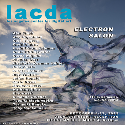 Digital art defines the contemporary. The Los Angeles Center For Digital Art is dedicated to the propagation of all forms of digital art, new media, digital video art, net art, digital sculpture, interactive multimedia, and the vast panorama of hybrid forms of art and technology that constitute our moment in culture. We are committed to supporting local, international, emerging and established artists through exposure in our gallery. We have an ongoing schedule of exhibits and competitions, produce editions of wide format archival prints, and collaborate in the production of digital artworks in our studio. As well we are involved with curating digital exhibits at institutions and festivals outside of the LACDA gallery schedule.