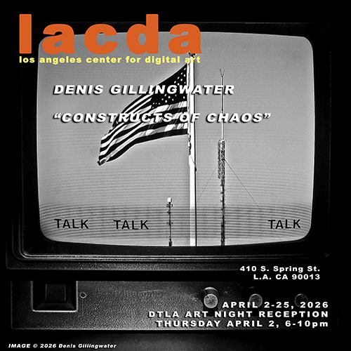 Digital art defines the contemporary. The Los Angeles Center For Digital Art is dedicated to the propagation of all forms of digital art, new media, digital video art, net art, digital sculpture, interactive multimedia, and the vast panorama of hybrid forms of art and technology that constitute our moment in culture. We are committed to supporting local, international, emerging and established artists through exposure in our gallery. We have an ongoing schedule of exhibits and competitions, produce editions of wide format archival prints, and collaborate in the production of digital artworks in our studio. As well we are involved with curating digital exhibits at institutions and festivals outside of the LACDA gallery schedule.