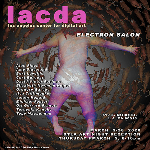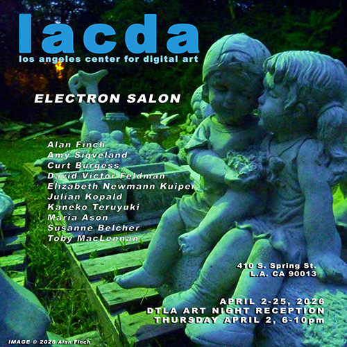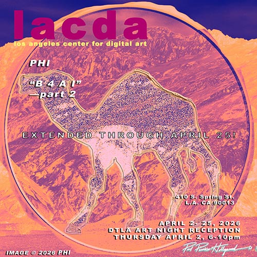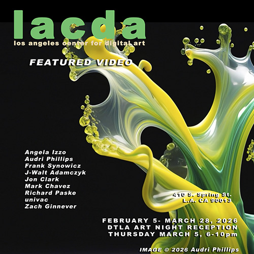 Digital art defines the contemporary. The Los Angeles Center For Digital Art is dedicated to the propagation of all forms of digital art, new media, digital video art, net art, digital sculpture, interactive multimedia, and the vast panorama of hybrid forms of art and technology that constitute our moment in culture. We are committed to supporting local, international, emerging and established artists through exposure in our gallery. We have an ongoing schedule of exhibits and competitions, produce editions of wide format archival prints, and collaborate in the production of digital artworks in our studio. As well we are involved with curating digital exhibits at institutions and festivals outside of the LACDA gallery schedule.