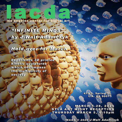 It was twenty years ago today… In.2004, Los Angeles Center for Digital Art, through the formidable energies and initiative of director Rex Bruce, opened its doors with its first exhibit. What followed is an incredible success story of hundreds of exhibits, screenings, panels, and performances that included collaborations with major curators and institutions including Centre Pompidou, The Broad, Museums and the Web, Guggenheim Gallery (Chapman University), Downtown Los Angeles Art Walk, California Museum of Photography (U.C. Riverside), New Media Center Santa Ana, Niche.LA Video Art, Silver Lake Film Festival, Downtown Film Festival–Los Angeles, photoLA, and photoSF. Curators from MoCA, LACMA, Riverside Museum, Hammer Museum, and others have participated in selecting artists for LACDA juried competitions.